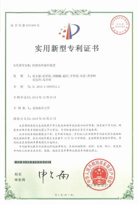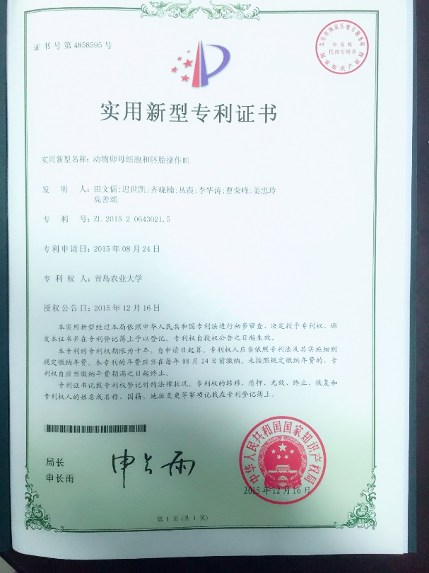 3. 动物卵母细胞和胚胎操作皿;田文儒,迟世凯,齐晓楠,丛霞,李华涛,曹荣峰,姜忠玲,高善颂,申请日期:2015年8月15日;实用新型;公开(公告)日 2015-12-16;公开(公告)号 204874551U,证书号:4858595;专利号:ZL201520643021.5
