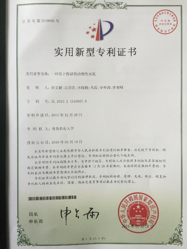 5. 田文儒,迟世凯,齐晓楠,丛霞,李华涛,曹荣峰 一种易拆卸的实验动物饮水瓶