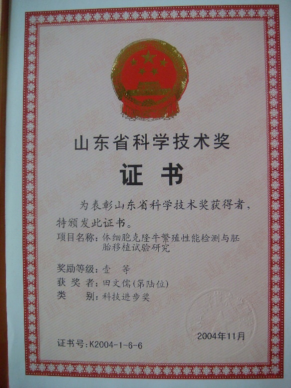 9. 体细胞克隆牛繁殖性能检测与胚胎移植试验研究,2005获山东省科技进步一等奖(第六名)。