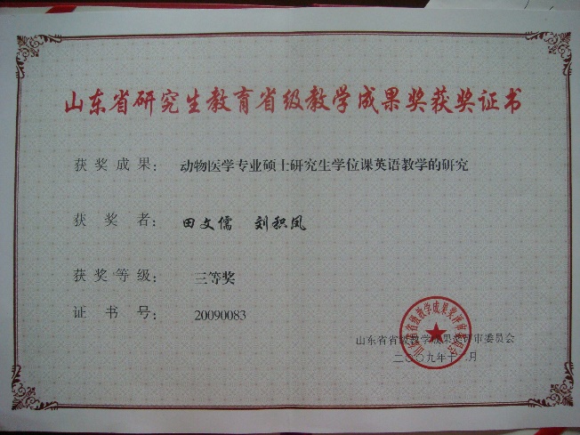 10. 动物医学专业硕士研究生学位课英语教学的研究,2009年获山东省研究生教育省级教学成果奖三等奖;
