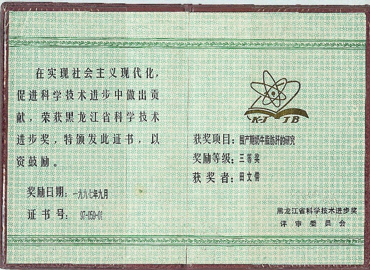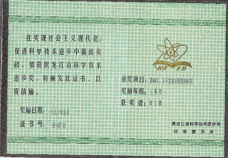3. 影响牛、羊子宫复旧因素的研究,1996年获黑龙江省政府科技进步三等奖;