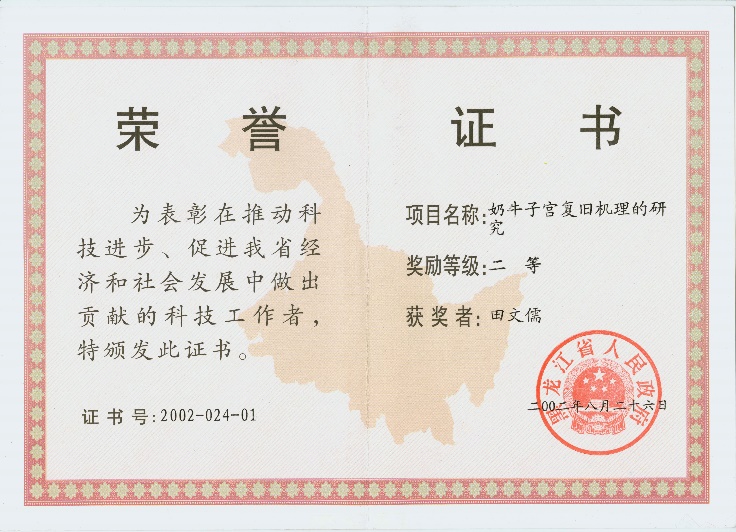7. 奶牛子宫复旧机理的研究,2002年获黑龙江省政府科技进步二等奖。