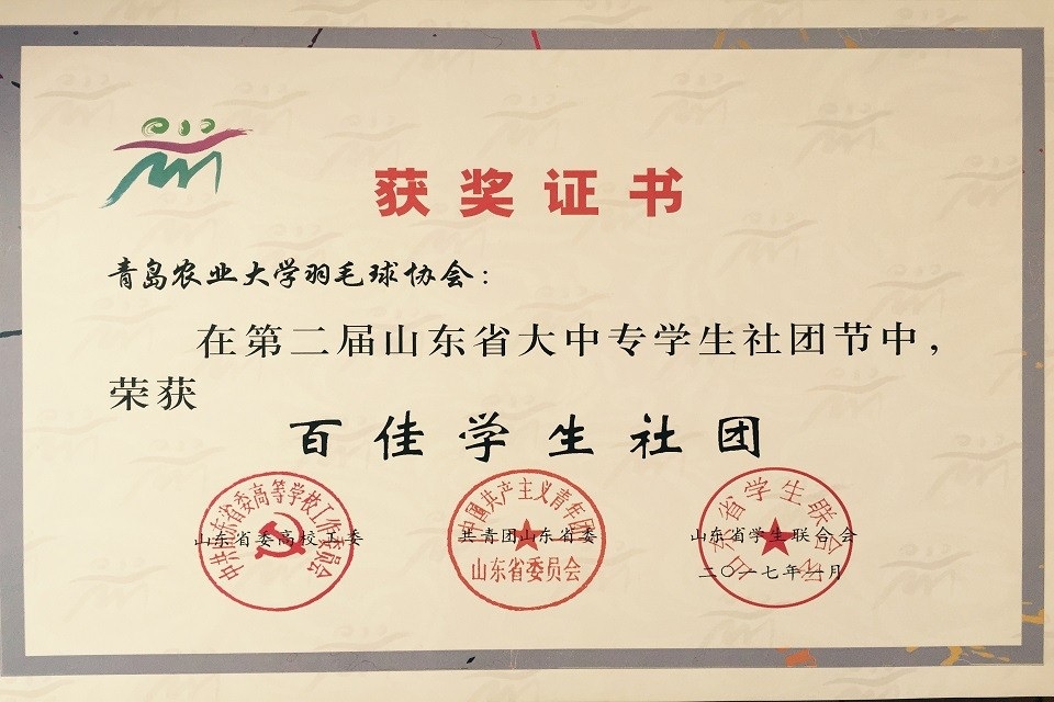 2016年11月团省委、省学联联合开展了2016年度山东省“百佳学生社团”评选活动,经层层评选,hga030皇冠手机登录地址羽毛球协会当选年度省“百佳学生社团”。