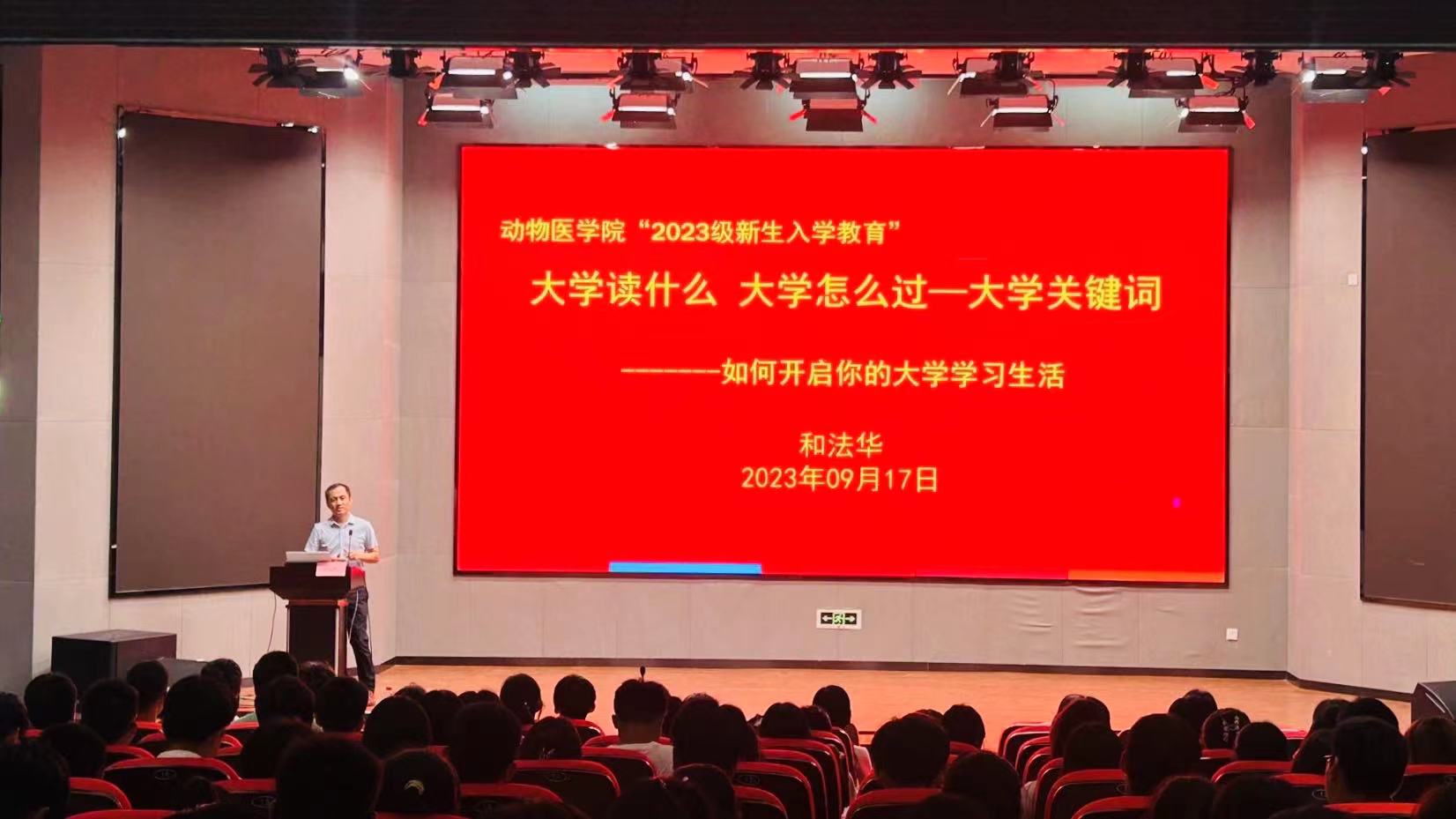 和法华以《大学读什么 大学怎么过——大学关键词》为题为新生讲授了“开学第一课”。他通过“热爱、独立、担当、成长”等几个关键词对新生寄语,要求全体学生尽快在思想上、心理上、行为上适应大学学习生活,加强独立自律,活成新时代大学生应有的样子。