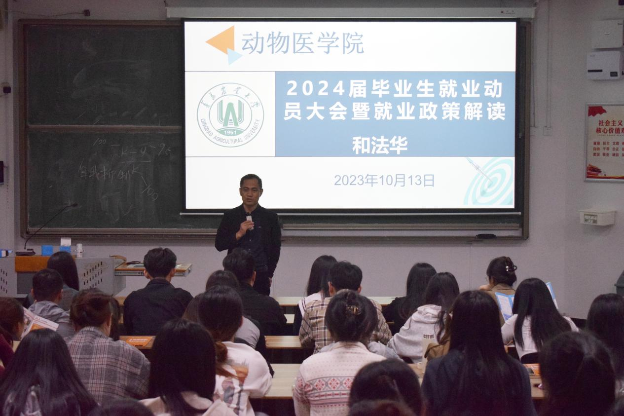 和法华从2024届毕业生就业形势、就业目标确立与就业方式、关于考研与就业、需正确面对的几个问题等方面为全体应届毕业生进行就业政策解读。他指出当前毕业生面临就业岗位需求收紧、政策性岗位拓展空间有限、就业结构性矛盾依然突出、毕业生焦虑情绪加剧等多重压力,他强调广大应届毕业生要正确认识自己,从思想上高度重视就业工作,适当降低就业期待,先就业再择业,行动上做好职业规划、个人简历、参加企业宣讲会、招聘会和实习实践等,同时把握住“金九银十”、“金三银四”等就业黄金时间节点,积极就业。