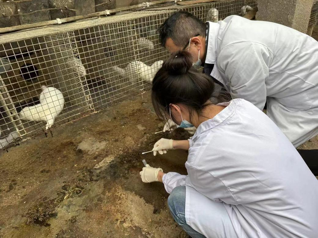 当日下午,曹志老师、温建新老师等人带领服务团成员于青岛海宝皮毛动物养殖专业合作社试验示范推广基地展开实地调查,通过观察和分析貂舍水貂的运动情况、饮食情况、毛发情况等,向同学们实地介绍了毛皮动物的几种常见疾病,如食毛症、自咬病等。最后,在老师的现场指导下,服务团成员并采取科学的抽检方法,采集临床样本100余份,为后续阿留申病毒的检测工作提供了充足的样本数据。