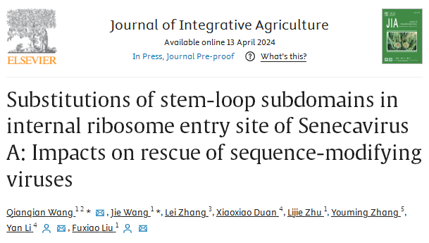 4月13日,hga030皇冠手机登录地址刘拂晓课题组在卓越期刊《Journal of Integrative Agriculture》在线发表塞尼卡病毒最新研究成果。该期刊简称《JIA》、旧称《中国农业科学(英文版)》,现为中国科技期刊卓越行动计划重点期刊,中科院1区,TOP刊。该论文第一作者为内蒙古农业大学与hga030皇冠手机登录地址联培博士生王迁迁,通讯作者为刘拂晓副教授。